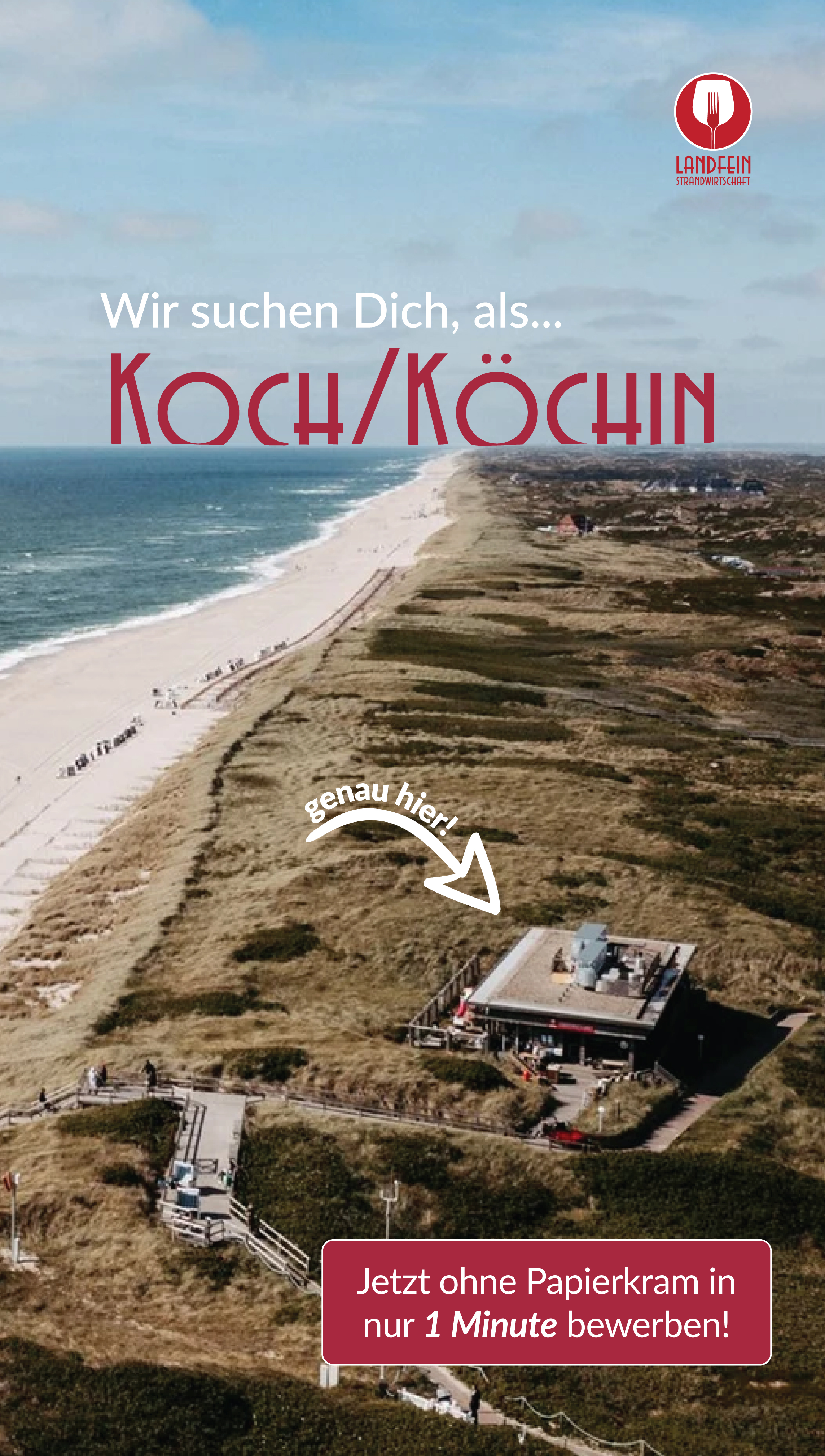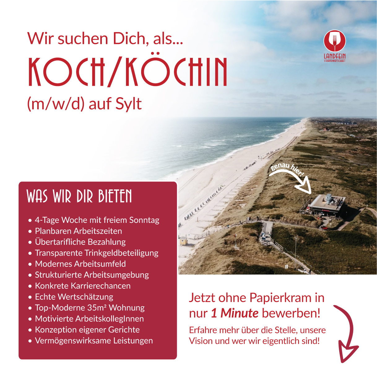 Für Landfein Sylt entwickelten wir ein Recruiting-System auf Funnel-Basis mit passenden Performance-Kampagnen, Anzeigen und Bewerbungslogik. Ergänzend produzierten wir Printmaterialien für den Standort, die als kommunikative Grundlage im Restaurant dienen und die Marke sichtbar machen.