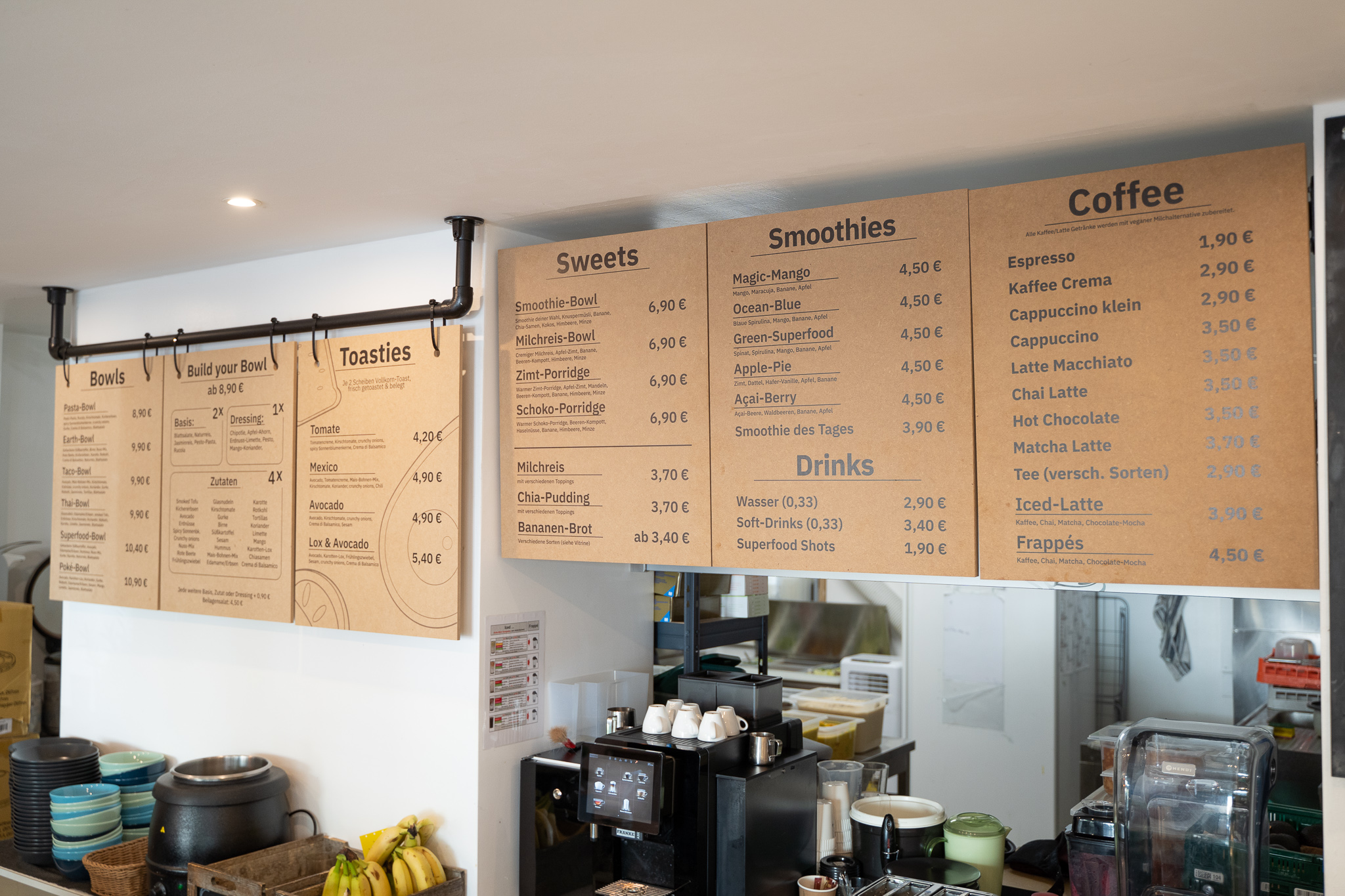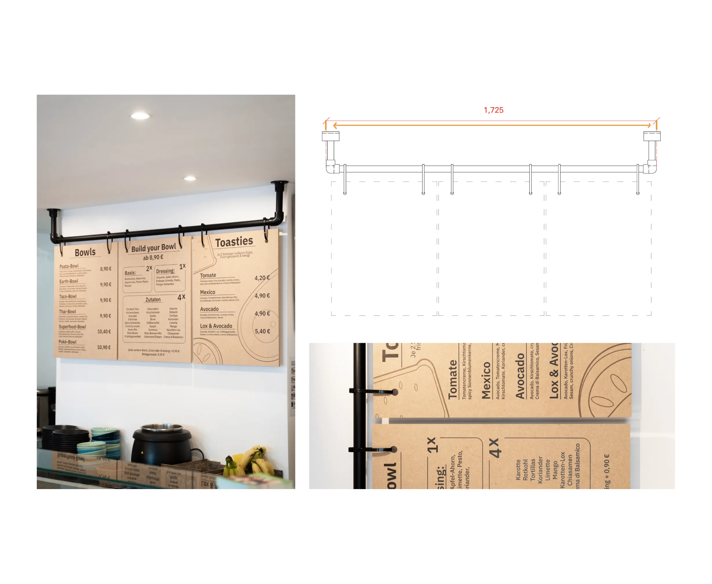 Das Ergebnis war ein von der Decke hängendes Rohrsystem zur Aufhängung der Menükarten: funktional, visuell integriert und leicht austauschbar. Die Karten selbst bestehen aus beidseitig bedruckbaren, recycelten MDF-Platten, die nach Gebrauch mit umweltschonender, einfarbiger Druckfarbe wiederverwendet werden können. Dazu entwickelten wir ein klares, markenkonsistentes Designsystem, das Lesbarkeit und Markencharakter vereint. Durch die gezielte Materialauswahl und Planung konnte auf Plastiktafeln verzichtet und das Budget eingehalten werden, ein Beispiel für nachhaltiges Design mit Systemlogik.